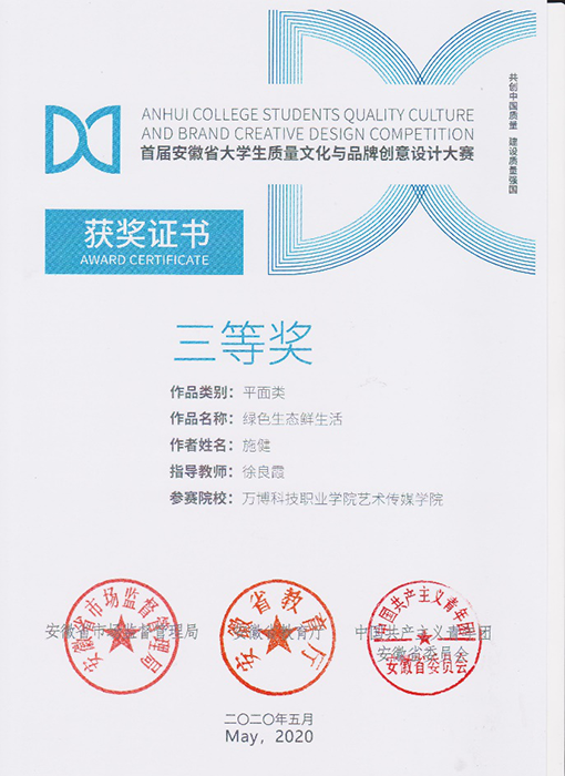 近日,在安徽省市场监督管理局 安徽省教育厅 中国共产主义青年团安徽省委员会关于公布首届安徽省大学生质量文化与品牌创意设计大赛获奖名单的通知中,我校报送的136件参赛作品中,最终斩获大赛一等奖两项、二等奖两项、三等奖五项。其中关松涛老师指导的文案类作品《吃的安心,吃的放心,虾稻米知你心》和《稻米与龙虾合作,营养与美味交融》分获一等奖;关松涛、徐良霞两位老师指导的策划类作品《源启于缘,成于“园”》和徐良霞老师指导的文案类作品《大自然的味道》分获二等奖;关松涛、徐良霞两位老师指导的策划类作品《绿色的你,由“棋”守候》,徐良霞老师指导的平面类作品《绿色生态鲜生活》和文案类作品《棋盘塔,生态中的金字塔》,关松涛老师指导的《品牌来自卓越,安泽成就质量》和《质量重于泰山,安泽重于质量》分获三等奖。关松涛老师被评为首届安徽省大学生质量文化与品牌创意设计大赛优秀指导教师,同时,我校获得优秀组织单位奖。