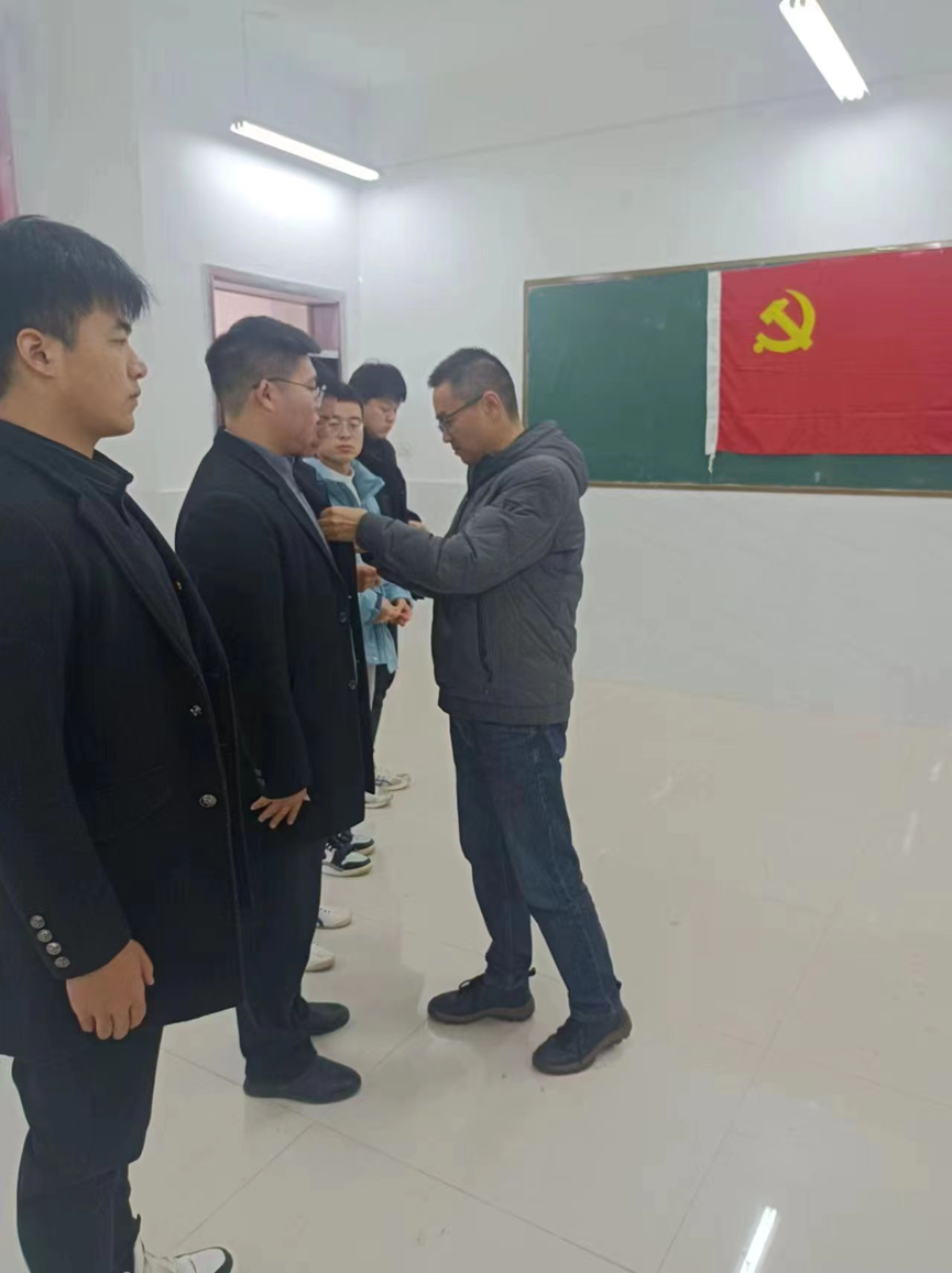 会议结束后,校长助理许华云为新发展的预备党员佩戴党徽。预备党员在党支部书记司斌斌的带领下向党旗庄严宣誓。