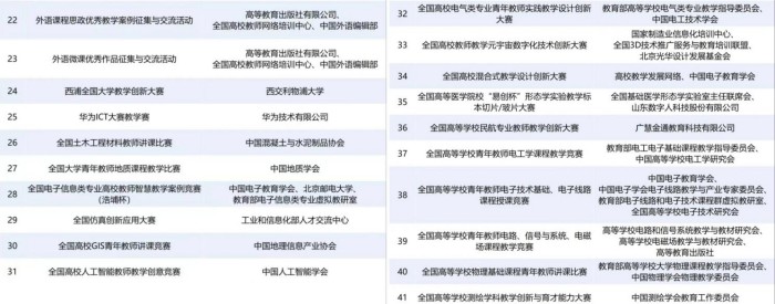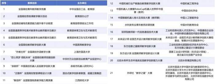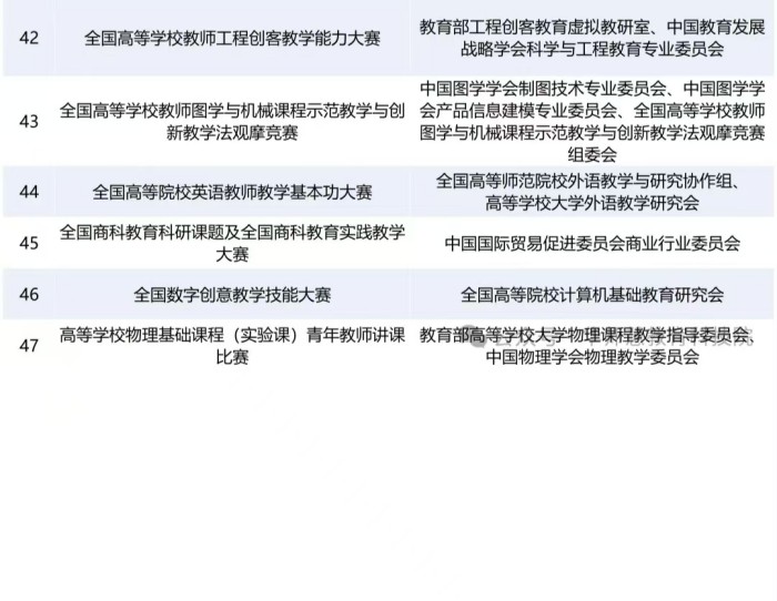 根据专家组于2025年11月10日发布的高校教师教学竞赛征集通知,经竞赛主办方自愿申报、形式审查、初评及专家委员会审议等环节,共遴选出47项赛事纳入2025年全国普通高校教师教学竞赛研究(详见下图)。分析报告采集了上述赛事自2012年至2025年共14年的数据,对高校教师教学竞赛现状进行了系统分析与研究。