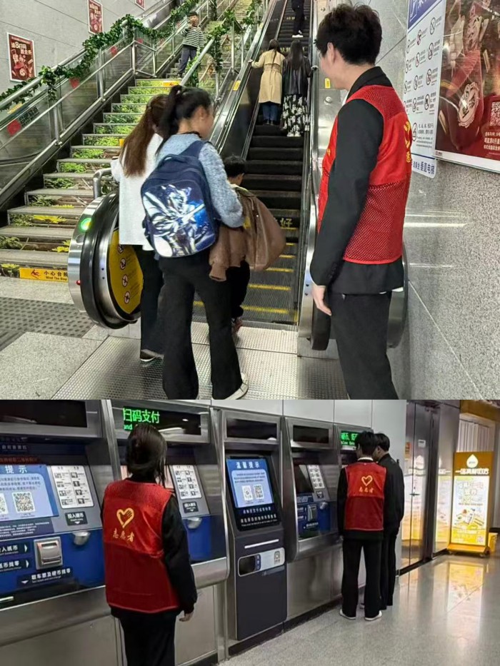 活动当天,志愿者们早早来到大蜀山地铁口,迅速投入服务工作。针对地铁口人流密集、通行压力大的实际情况,大家分工协作、井然有序。一部分志愿者在楼梯出入口引导乘客安全上下,提醒注意脚下,耐心帮扶老人、儿童及携带重物的行人,确保通行顺畅;另一部分志愿者驻守自助售票区,为不熟悉操作的市民提供一对一指导,协助完成购票,有效缓解了高峰时段的拥堵状况。志愿者们以细致周到的服务赢得了往来市民的广泛好评,也展现出当代大学生服务社会、服务人民的良好风貌。
