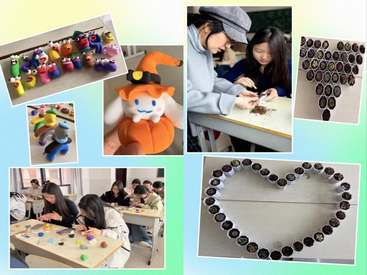 许莹老师以黏土创作 + 多肉种植为核心,提前精心筹备材料与实践方案,课堂上全程示范指导,耐心帮扶动手能力较弱的学生,严守安全规范,引导学生协作完成作品。超轻黏土创作中,同学们尽情发挥创意,用指尖塑造出灵动多样的造型,尽显动手能力与审美素养;多肉种植环节,大家认真学习养护知识,亲手培土、栽种,在照料绿植中体会劳动乐趣,感悟生命成长的意义。