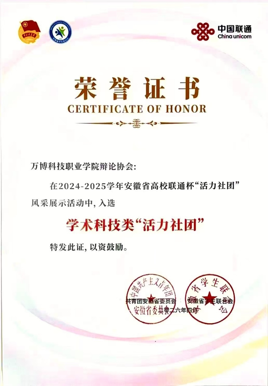 参展过程中,我校辩论社团立足自身定位、深耕育人特色,精心打造沉浸式互动体验与实景化成果展示我校参展学子以饱满热情展现社团风采、交流建设经验,为全省高校校园文化交融共生注入万博青春活力。活动现场,团省委、省学联为参展协会颁发荣誉证书,我校辩论协会获得学术科技类“活力社团”荣誉证书。